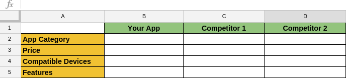A correct analysis can make your app launch successful, and will get your app in front of the right audience. To get started with your app pre-launch marketing strategy, have an excel sheet in hand just like the one we created below and find out where your app stands amidst the huge app population.